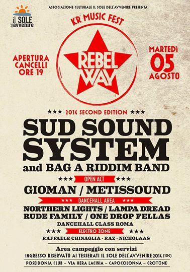 Finalmente è arrivato il momento per Northern Lights di tornare nella calda ed accogliente Calabria, questa volta non saremo a Soverato, ne a Catanzaro, ma per la prima volta suoneremo a Crotone all’interno della manifestazione “REBEL WAY FESTIVAL” invitati dai nostri amici di Rude Family sound. Nella stessa sera oltre a Northern Lights sound anche Sud Sound System, Gioman, Lampa Dread e molti altri.