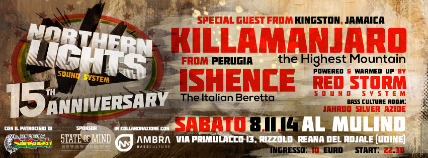 Dopo il successo del quattordicesimo anniversario di Northern Lights sound con ospite speciale Stone Love “the immortal sound” dalla Jamaica, quest’anno la crew udinese condividerà la consolle con due ospiti, il meglio della scena sound system nazionale e mondiale: I Shence da Perugia ed in esclusiva per il Triveneto, Killamanjaro sound “The highest mountain”, icona della cultura sound system della Jamaica.
